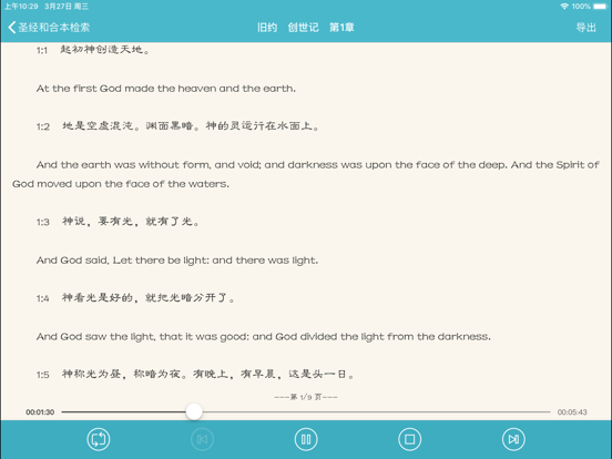 "description": "圣经和合本音乐版APP,不仅可以方便人们阅读中英文圣经,而且可以聆听。《圣经》有几个版本的诵读版本,这个APP中选择了音质最好的音乐版音频。您的手机将成为随身携带的《圣经》。\n\n《圣经》不仅仅是一本宗教读物,其中更融合着历史、文化、政治、经济。它与希腊文明一起,形成了今天的欧美文化。圣经是西方文化的重要源泉,也是一部包罗万象的百科全书。它是世界上发行量最大,发行时间最长,翻译成的语言最多,流行最广而读者面最大,影响最深远的一部书。\n\n[温馨提示]: \n由于我们选取了最好的音乐版朗读音频,而且是离线方式,所以APP的尺寸大于同类APP。\n\n该电子书采用了iOS系统流畅而稳定的翻页技术与排版技术,所有经文与诵读音频都放在了设备端,完全离线阅读,不受有无网络的限制,不浪费手机流量与电量,使用体验很好。 \n\n该应用采用了iOS的翻页与排版技术,所以阅读使用前,请确保您的iOS设备至少升级到iOS9。 \n\n支持iPhone与iPad等。\n\n支持章节进度快速浏览功能。\n\n支持显示播放诵读音频进度。\n\n支持检索功能。\n\n支持文字与朗读同步。\n\n支持横屏竖屏。\n\n支持“换肤”功能。\n\n这个电子书应用会不断的升级更新,不断修订瑕疵,不断校订错误,不断提供更好更佳的阅读体验。\n\n随时提出改进意见。谢谢您的鼎力支持,祝您阅读愉快。",