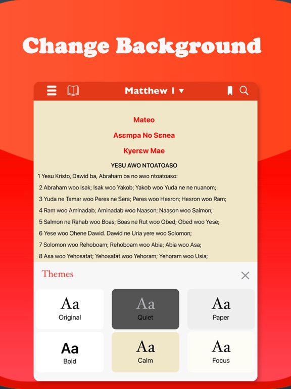 "description": "Welcome to the Twi Bible Akuapem app – the perfect tool for deepening your spiritual journey and connecting with the divine through the sacred verses of the Bible.\nYou don’t have to strain your eyes and read the Bible because from Genesis to Revelation is being read. This reading is not typical Twi reading, but modern reading.\nBrethren, this is the Twi Bible Asante you are looking for with great features.\nThere is no other Twi Bible with complete audio Clean and perfect than this. Versions.\n\nThe FASTEST Twi Bible app and most efficient way to read & study the Bible. Quickly navigate to any verse and easily access tools to help further your understanding of the Bible.\n Specifically tailored for speakers of the Akuapem Twi dialect, this app provides a seamless and enriching experience for anyone seeking to explore the holy scriptures in their native language.\nKey Features:\n1.\tComplete Twi Akuapem Bible: Immerse yourself in the rich and poetic language of Akuapem Twi with the entire Bible at your fingertips. From Genesis to Revelation, every chapter and verse is thoughtfully translated to bring the sacred text closer to your heart.\n2.\tUser-Friendly Interface: Navigating the scriptures has never been easier. Our user-friendly interface ensures a smooth and intuitive experience, allowing you to focus on the Word without distractions.\n3.\tOffline Access: Access the Twi Akuapem Bible anytime, anywhere, even without an internet connection. Carry the divine teachings with you, whether you're in the comfort of your home, on a journey, or attending a worship service.\n4.\tSearch and Share: Find specific verses or passages effortlessly with our powerful search feature. Share your favorite scriptures with friends and family through social media, messaging, or email to spread the message of love and wisdom.\n5.\tVerse of the Day: Receive daily inspiration with a handpicked verse to start your day on a positive note. Let the timeless wisdom of the Bible guide and uplift you in every aspect of your life.\n6.\tAudio Bible: Immerse yourself in the spoken word of God with our upcoming Audio Bible feature. Listen to the scriptures being read aloud to enhance your understanding and connection with the divine message.\nExperience the power and beauty of the Twi Akuapem Bible in a digital format that complements your modern lifestyle. Download the app now and embark on a spiritual journey that transcends language barriers, bringing you closer to the heart of God.\nMay the Twi Bible Akuapem app be a source of inspiration, comfort, and guidance on your path of faith.\n\nBrethren, spread the word of the Lord by letting friends, parents, love ones and everybody knows that by God’s grace Twi Bible and Audio is also Available. Don’t keep this for only yourself, but spread the word.\n\nTerms & Condition visit:\nhttps://www.termsfeed.com/live/e6f9585f-6631-4d71-b930-b8fed3f5a735 Bless you!!",