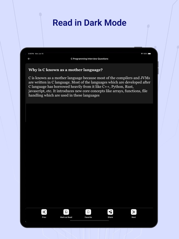 "description": "The C programming app will teach you everything to help you crack C programming interview questions.\n\nC programming is a general-purpose programming language.\n\nIn this modern era where everything is automated, technology has taken a huge rise. When I say technology, computers are everything, especially in the IT field. There are various computer languages available, and the one who knows them all is notable. Staying updated and learning new things will always help us grow personally and professionally.\n\nUsing C programming, we can do stuff like designing compilers, developing operating systems, graphical user interfaces, brose engines, and embedded systems.\n\nIn the C programming app, we learn about C language introduction, the basics of C programming, C programming coding interview questions, how to use the C program to swap two numbers, C program to find ASCII, C program to print lowercase and uppercase, and so much more.\n\nFEATURES OF THE APP:\n\t•\tThe C programming interview questions app has a very user-friendly interface. You just have to open the app and select any topic you want to learn about, and all the answers will be displayed.\n\n\t•\tThe app has a separate folder called \"Library”, which can be used as a personal reading list of topics you wish to learn in the future and can also add to favourites any topic you enjoyed and loved learning.\n\n\t•\tThemes and Fonts can be customised according to your reading style.\n\n\t•\tThis app's main motive is to sharpen the user's IQ with all C language interview questions.",