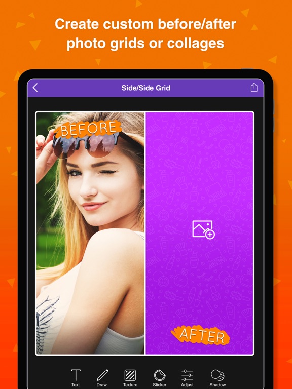 "description": "Before After Collages to create collages with Before Pictures and After Pictures. Add Text, Drawing on before after picture maker to convey messages.\n\nThe before after picture maker in Collage Style is best way to convey Changes in your Body like Weight Loss or Body Building Pictures. Before and after picture in one simple Collage to convey message.\n\nImproved Before after Photos now comes in 5 Styles:\na. Weight Loss Photo Collages - Four Collages with Weight Loss Apps Theme where you can Show Weight Loss Tracking Pictures. 2 Collages designed for Weight Loss Pictures for Women.\nb. Makeup Photo Collages - Photo Collages to show off Makeup on you. Show off your before and After Pictures with and without Makeup.\nc. Body Building Photo Collages - Show off your Body building Photos with Body Building Exercise themed Photo Collages. Best suited for BodyBuilding Photos.\nd. Home Makeover Photo Collages - Show off Home Make over Photos with before and after Home Makeover Photos.\ne. Side by Side Pictures - Before after collages now include side by side photo editor to put before after pictures side by side.\nf. Photo on Top of Photo - Add Before after photos now include photo on photo for better Before after picture comparison.\ng. Before After Collages come in Free form collages and its easy to make your own collages:\n1. Select one of many before and after picture Collage Textures. Wide variety of before and after picture collage Textures are available for various differences.\n2. Add Before and After Pictures to Collages and adjust the photos with 2 finger gestures.\n3. Add Text over before and after pictures and Draw over them to convey message.\n4. Change Textures for before and after picture Collages.\n5. Save and Share Before After Collages with friends and family.\n\nBest Collages for conveying your Changes.\n\n\nThe subscription Unlock all the new features and Remove Ads\n\n\nThe in-app purchase is charged to your iTunes account.\n\nThe auto-renewal of subscription can be turned off via iTunes account settings after purchase.\n\nThere are three options for in-app purchase namely are as follows\n\nA> Monthly subscription with 3-Day Free Trial only for $3.99.\n\n\nThe subscriptions automatically renew unless the subscription is canceled when the subscription period expires\n\n\n• Subscription automatically renews unless auto-renew is turned off at least 24-hours before the end of the current period\n\n• Account will be charged for renewal within 24-hours prior to the end of the current period, and identify the cost of the renewal\n\n\n• Subscriptions may be managed by the user and auto-renewal may be turned off by going to the user's Account Settings after purchase\n\n• Any unused portion of a free trial period, if offered, will be forfeited when the user purchases a subscription to that publication, where applicable\n\n\nTerms of use: http://www.dexati.com/iosterms.html\n\nSubscription Info: http://www.dexati.com/iossubscriptions.html",
