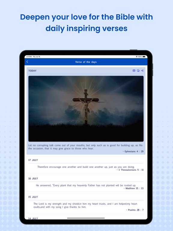 "description": "ESV is nothing but the English standard version of the Bible. The Bible has original Hebrew, Aramaic, and Greek texts. Though it contains original texts, the Bible is framed in a way suitable for modern readers as well.\n\nWhether you're after the Bible verse of the day or just scrolling through to find good Bible verses that hit you right in the heart, this version doesn’t disappoint.\n\nSometimes you just need to hear the Bible talking about life in a way that actually makes sense right now. Maybe you’re just looking for some uplifting Bible verses to get you through a tough week, or you want a Bible verse about love that actually feels real and meaningful. \n\nFeatures:\nAudio Bible - Listen to the words of the Bible Scriptures.\n\nDaily Verse - Once you set the reminder, you will receive day-to-day notifications to read your daily Bible verses.\n\nMY LIBRARY - It is like the personal space for the user, as it contains all the highlighted points and notes you make from reading the Bible. You can also bookmark the best Bible verses that you love.\n\nOur Bible app contains both the Old and New Testaments.\n\nVerse Editor - Bible verses paired with beautiful background images. Choose your favorite verse, match it with a suitable image, create your post, and share it with friends and family on social media.\n\nNearby churches - The app provides information about nearby churches based on your location.\n\nEBooks - We offer a wide selection of Christian eBooks for your reading.\n\nWallpapers - Many beautiful varieties are available.\n\n\fVideos - It has videos on so many topics, such as Jesus, Sad, Hope, Blessings, Alone, Wisdom, Motivation, Gratitude, Blessings, God’s Promises, forgiveness, healing, and considerably more.\n\nFestive Calendar - It contains all the Christian festivals and feasts.\n\nPopular verse - We have Bible verses arranged by topics like love, fear, peace, and much more.\n\nChurch Laws - This includes church etiquette such as standing, greeting, respectful conduct, following social and prophetic laws and more.\nCustomise Your Bible- You can change the font and colour of the text according to your preference. Make your online Bible reading a comfortable space for you.\n\n1000 Praises - ‘1000 Praises’ is a devotional recitation honouring God through a thousand titles and attributes.\n\nBible Quotes - It has the best Bible quotes in the form of images and text that can be shared on social media with your friends and family.\n\nBible Quiz - Test your knowledge with the Bible Quiz.",