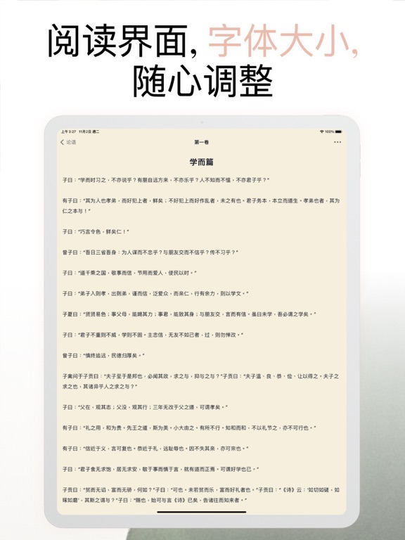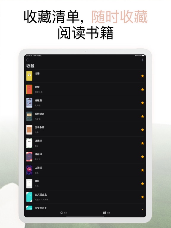 "description": "閱讀經典,體驗中華經典古籍和文化!我們更新了:大唐西域記,隋唐演義,鶡冠子,關尹子,呂氏春秋,醒世恆言,二刻拍案驚奇,公孫龍子,墨子,文子,尉繚子,列子,千家詩,浮生六記,隋煬帝艷史,顏氏家訓,荀子,淮南子,夢溪筆談,初刻拍案驚奇,文心雕龍,管子,周易,豆棚閒話,山海經,菜根譚,鏡花緣,道德經,中庸,大學,尚書, 論語,古文觀止,喻世明言,孫子兵法,東周列國志,孝經,桃花扇,洛神賦,金石緣,封神演義,儒林外史,孟子,莊子,冰鑑,韓非子,商君書,禮記,左傳,老殘遊記。\n讀者可以根據需要自由調節字體大小和背景圖片。",