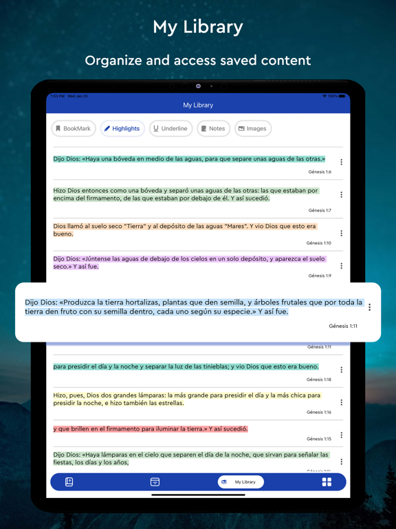 "description": "The Reference Bible for iOS is an essential tool for anyone interested in Bible study. With this application, you will have quick access to notes and commentaries from Bible experts, as well as a version of the Bible in Spanish (Reina-Valera).\n\nLIST OF FEATURES IN SHORT\n\n# Elegant and Simple UI: An elegant and simple user interface.\n# Easy Access: Access anytime and anywhere just by swiping the screen.\n# Works Offline: Read the Holy Bible offline without internet access.\n# Daily Verse: Start your day blessed with a daily verse.\n# Easy Reading: Adjust font, text size and contrast for bright or low-light.\n# Night mode: Low-light reading mode to facilitate reading at night.\n# Highlights: Mark favorite verses with different colors.\n# Bookmarks: Catch up where you left previously.\n# Notes: Add important notes or comments for future reference.\n# My Library: Organize and approach saved content in seconds.\n# Quick Search: Make a quick search for any book or chapter.\n# Share Your Favorites: Share your favorite verses with friends on social media.\n\n\nThe user interface is intuitive and easy to use, allowing you to easily navigate through the books of the Bible and search for specific verses. It also features a bookmarking feature, which allows you to bookmark your favorite verses and return to them with ease. In addition, the app offers an advanced search feature that allows you to search for keywords in notes and comments.\n\nThe Reference Bible for iOS also includes a wide variety of Bible study tools, such as commentaries and devotionals, to help you deepen your understanding of the Scriptures. These tools will help you gain a better understanding of God's Word and apply it to your daily life.\n\nIn short, if you are looking for a Bible reference tool to help you in your Bible study, the Reference Bible for iOS is the perfect app for you. Download this application now and start enjoying a more enriching and complete Bible study",