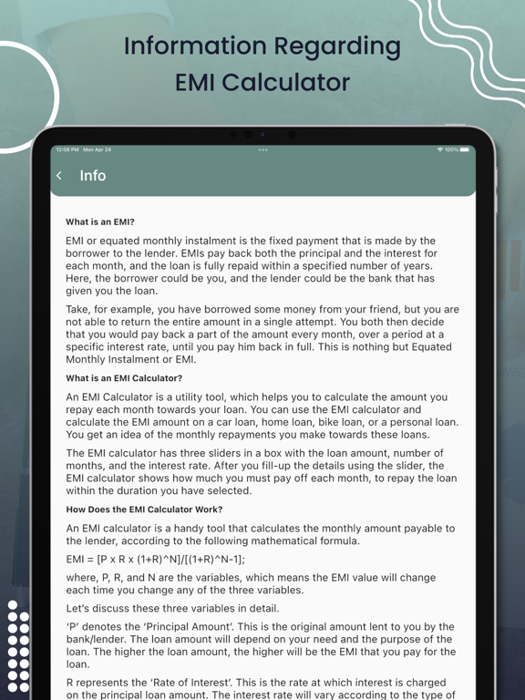 "description": "An EMI (Equated Monthly Installment) calculator app is a useful tool that helps you calculate the monthly payments that you need to make towards a loan. This app is particularly helpful if you are planning to take out a loan or have an existing loan and want to know how much you need to pay each month.\n\nThe EMI calculator app requires you to input some basic information such as the loan amount, the interest rate, and the loan tenure. Once you provide this information, the app calculates the monthly payment that you need to make towards your loan.\n\nAdditionally, the app may also provide you with a detailed payment schedule, which shows you the amount of principal and interest that you pay each month. This can help you plan your finances better and ensure that you don't miss any payments.\n\nOverall, an EMI calculator app is a useful tool that can help you make informed decisions about your loans and ensure that you manage your finances effectively.",