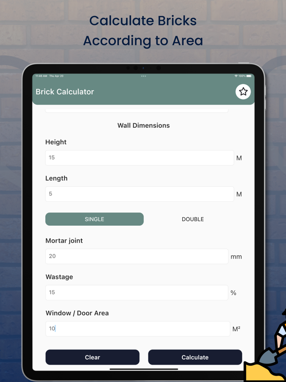 "description": "The Bricks Calculator app is a tool that allows users to calculate the number of bricks needed for a construction project. It is designed to help both professional builders and DIY enthusiasts to quickly and accurately estimate the amount of bricks required for their project.\n\nThe app provides a user-friendly interface where users can input the dimensions of the wall or surface they plan to build. They can specify the height, width, and length of the surface and choose the type of brick they want to use. The app will then calculate the number of bricks required, taking into account factors such as mortar thickness and wastage.\n\nIn addition to providing an estimate of the number of bricks needed, the app also provides users with a cost estimate based on the price per brick and the total number of bricks required. This allows users to plan their project and budget accordingly.\n\nIt is a convenient and useful tool for anyone involved in building or construction projects.",