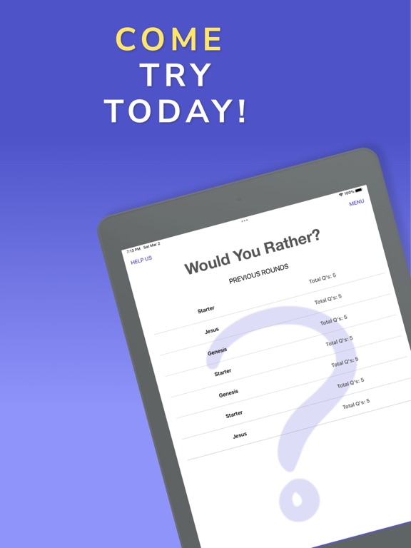 "description": "Would You Rather - Bible Edition is an entertaining and captivating game based on biblical themes and books of the Bible. The questions are designed to be fun and thought provoking. Use this app on your own, as an icebreaker, or as a group discussion starter. \n\nFeatures:\n- Simple and easy to start, and use\n- Hundreds of questions\n- Frequent updates, with new questions added\n- Works offline, no internet required\n\nCurrent Packs:\n- Starter (30)\n- Jesus (60)\n- Easter (60)\n- Book of Genesis (60)\n- Book of Proverbs (60)\n- Book of Isaiah Pt 1 (60)\n- Book of Isaiah Pt 2 (60)\n- Books of Galatians, Ephesians, Philippians (60)\n- Books of Colossians, 1 & 2 Thessalonians, and 1 & 2 Timothy (60)\n\nThis app has just launched! Get in on the ground floor. Expect many more packs in the upcoming months!\n\nExperience a unique blend of entertainment and enlightenment. Let the game spark meaningful discussions, deepen your understanding of biblical truths, and inspire you to live out your faith with courage and conviction. Download the app and give it a try today!\n\n\nAuto Renewable Subscriptions:\n\nYearly Pass subscriptions allow for ad free play, access to all charade packs, ability to record video/audio of the game. You will be charged through your App Store account. Subscriptions help support the app team, and allow us to continue to provide new content, updates, fixes, and additional features.\n\nSubscriptions will automatically renew unless cancelled within 24-hours before the end of the current period. You can cancel anytime within your iTunes account settings. Any unused portion of a free trial (if applicable) will be forfeited if you purchase a subscription.\n\nTerms and Conditions (EULA): https://www.apple.com/legal/internet-services/itunes/dev/stdeula/\nPrivacy Policy: https://www.chuchutrain.com/privacy-policy.html",