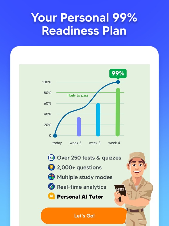 "description": "Pass your ASVAB (Armed Services Vocational Aptitude Battery) exam on your first attempt! Access realistic practice exams and quizzes to enhance your chances of passing the real test with ease. With over 2,000 expert-written questions, comprehensive explanations for each question, and a wide variety of tests and quizzes, this is your ultimate resource for ASVAB exam preparation.\n\nIntroducing our cutting-edge AI feature powered by ChatGPT, designed to enhance your ASVAB exam preparation journey. With this innovative tool, you'll receive real-time, personalized assistance on the most challenging and perplexing exam topics. Our AI, trained on the latest exam content, integrates seamlessly into the question interface, offering detailed clarifications on both correct and incorrect answers, and providing further guidance to deepen your understanding. Whether you're grappling with complex concepts or seeking to refine your knowledge, our AI companion is here to support you every step of the way, ensuring you're fully prepared to ace your ASVAB (Armed Services Vocational Aptitude Battery) exam.\n\n## Pass On Your First Try ##\n\nOur ASVAB exam prep application is acclaimed for its comprehensive content analysis, advanced learning techniques, and meticulous accuracy. We thoroughly cover every section of the latest exam, continually updating our materials to remain current. For both correct and incorrect answers, we provide detailed explanations to enhance understanding of key exam concepts.\n\nMoreover, our mobile app offers a personalized study plan tailored to your skill level, study frequency, and target test date. Unsure about your exam date? You can modify your study plan as often as needed. Our unique readiness score will guide you in determining when you're ready to take the real exam and achieve a high score on your first attempt.\n\n## Designed & Developed by Professionals ##\n\nKey Features:\n\n• ASVAB Exam Preparation\n• Personal AI Tutor for Hard & Confusing Topics\n• Unlimited Access to AI Study Features\n• Broken Down by Sub-Topic for Effective Studying\n• 2,000+ Realistic Questions\n• 250+ Tests and Quizzes\n• Detailed Explanations\n• 5 Test & Quiz Modes\n• Designed By Experts\n• Helpful Community Stats\n• Progress Tracking & Metrics\n• Helpful Reminders & Widgets\n\n\nFor more information on our Terms of Use and Privacy Policy, please visit the following websites:\n\nhttps://pixelpioneersllc.com/terms\nhttps://pixelpioneersllc.com/privacy",